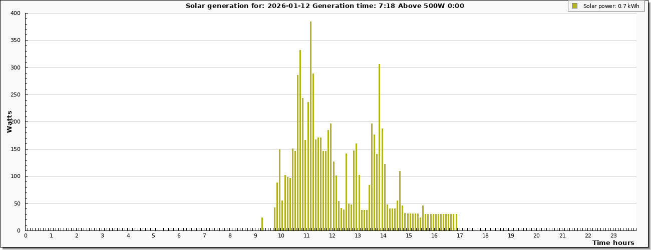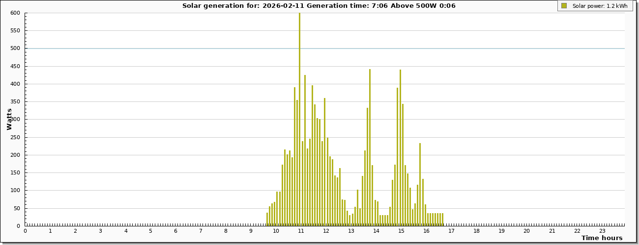 | Graph derived from live generation values taken from inverter at six minuite intervals |