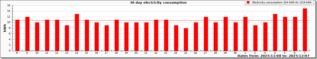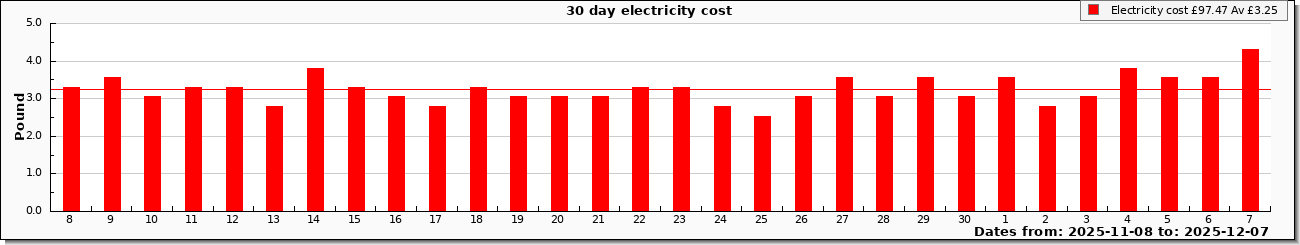 | Graphs updated from meter pulses, values rounded to 1 kWh. Cost graph includes standing charge |